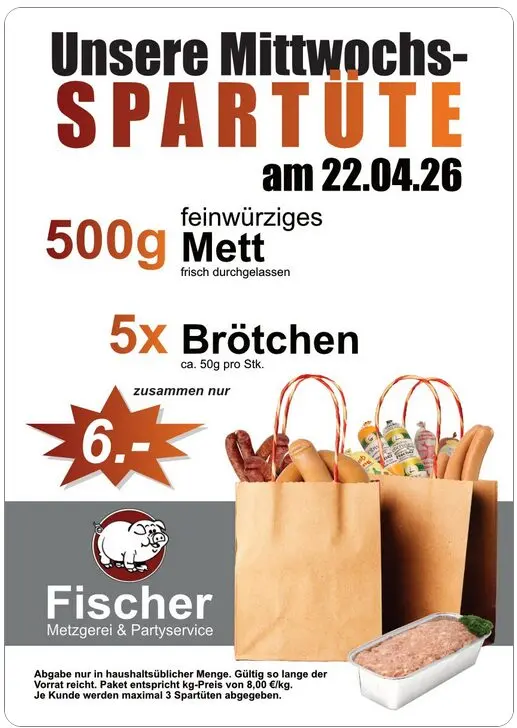 Jeden Mittwoch versorgen wir Sie mit attraktive Sonderangeboten zum Sparpreis. Die Mittwochs Spartüte besteht diese Woche aus: 500g feinwürziges Mett (frisch durchgelassen) + 5x Brötchen (ca.50g pro Stück). Zusammen für nur 6 Euro. Greifen Sie zu.