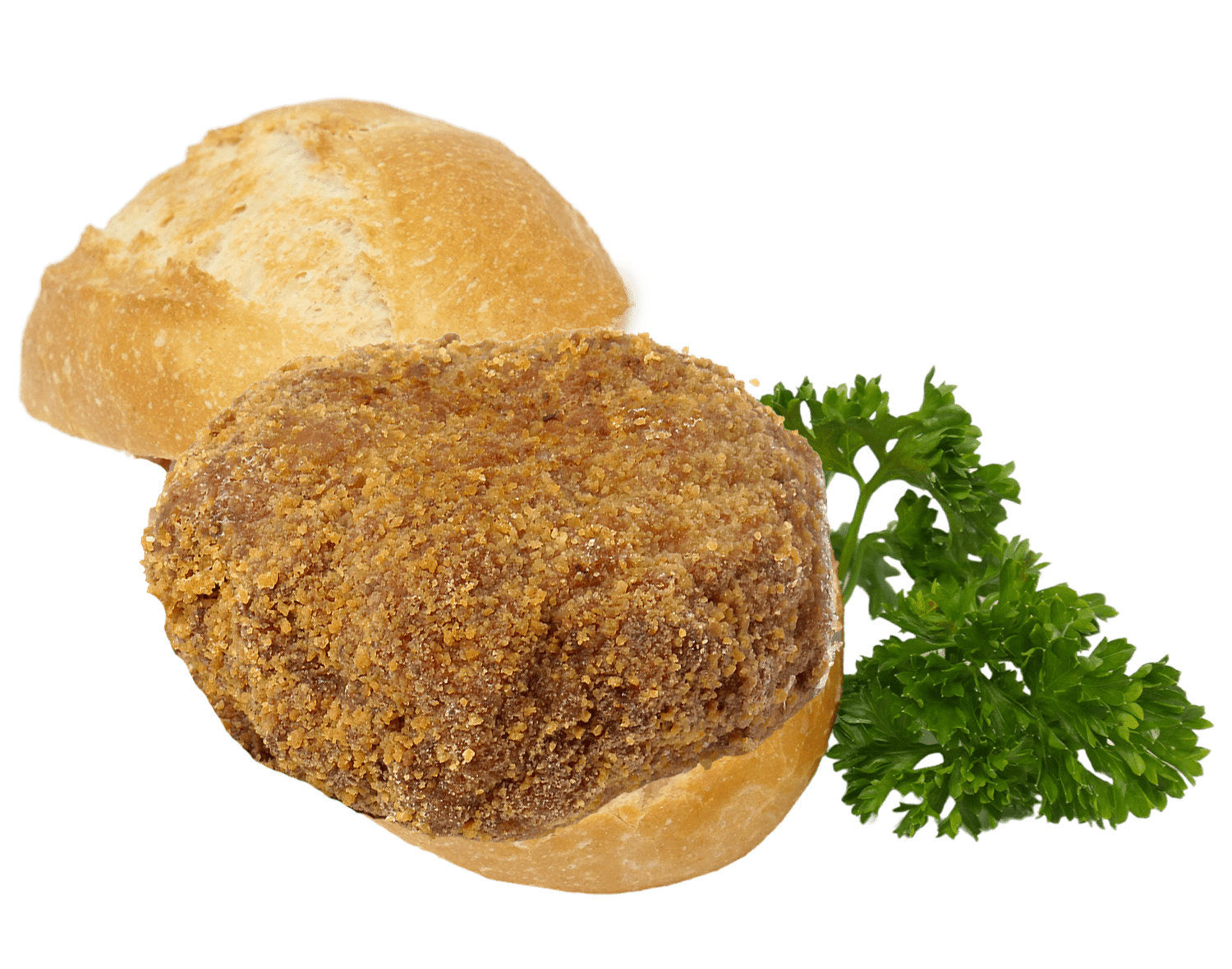 Ofenfrisches Weizenbrötchen, dick mit saftiger, goldbraun gebratener Frikadelle belegt.