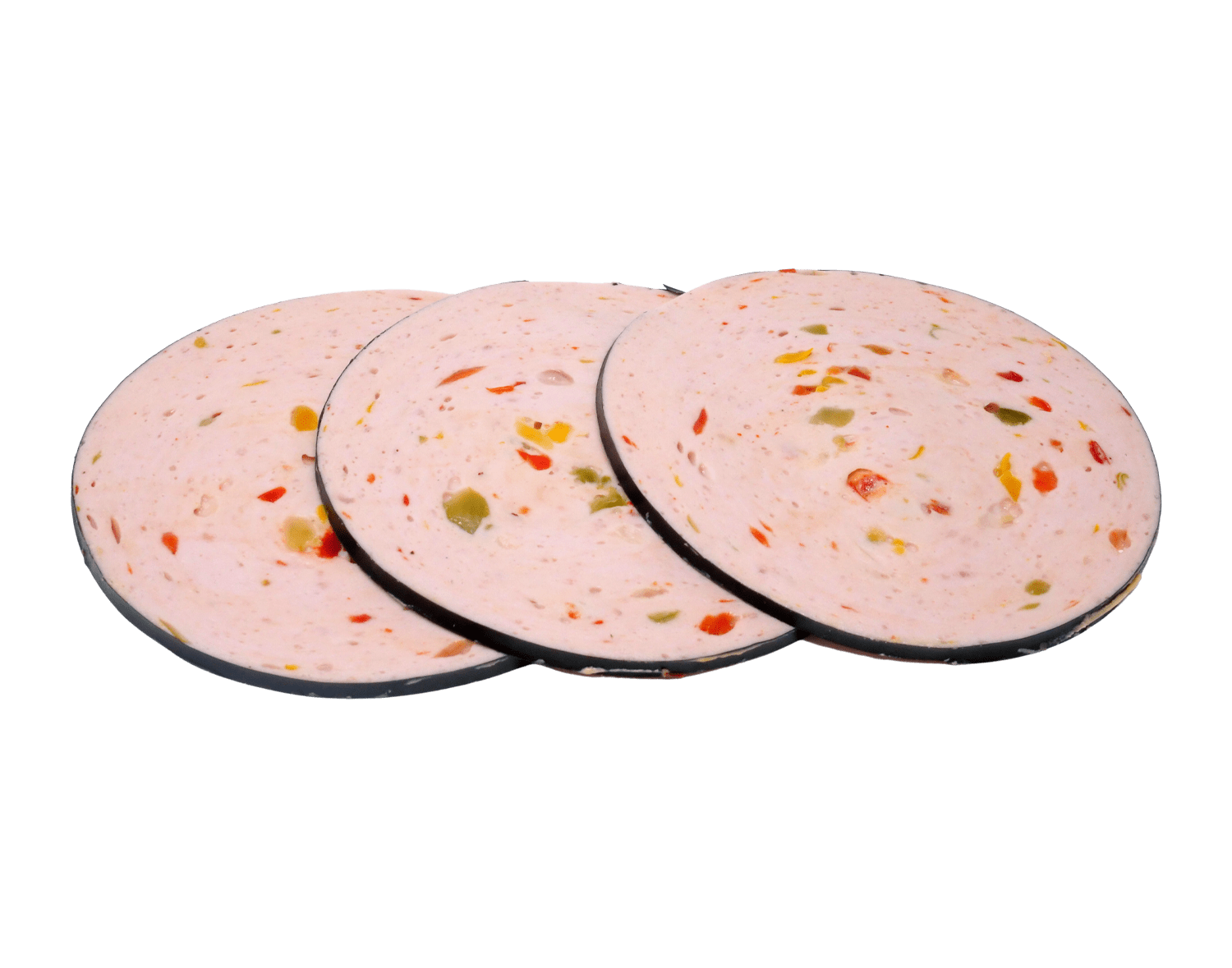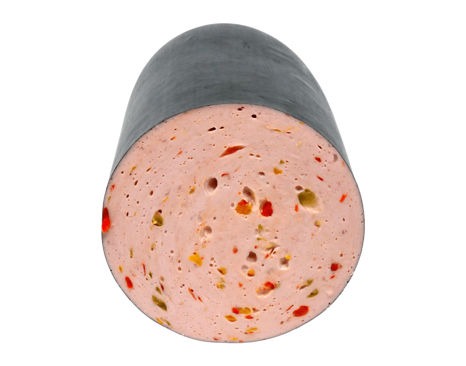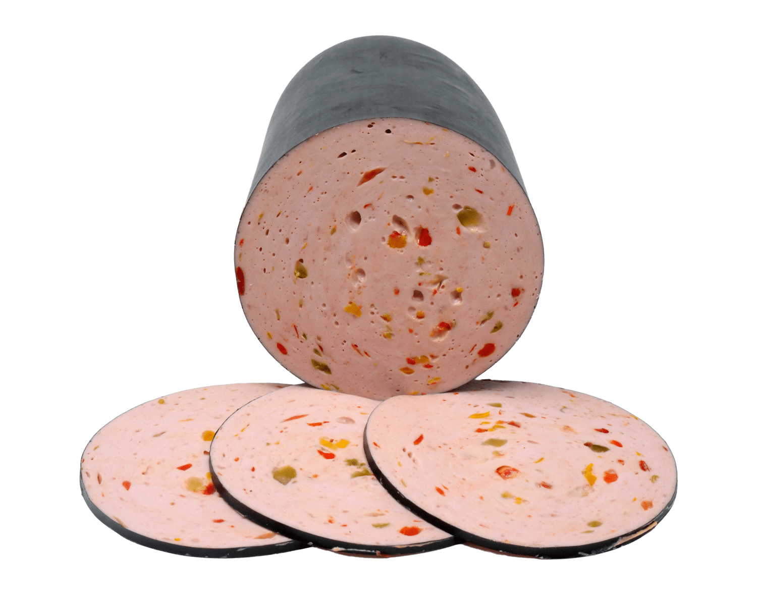 Unsere Mortadella mit Paprika darf zu keiner Brotzeit fehlen. Die würzige Brühwurst stellen wir aus Rind- und Schweinefleisch her. Diese Variante der Mortadella wurde mit Paprika angereichert. Sie erhalten so eine sehr feine pikante, schnittfeste Wurst, die sich trefflich als Aufschnitt für eine deftige Brotzeit daheim und unterwegs eignet. Die saftige und fruchtige Paprikaeinlage verleiht dieser Mortadella die besondere Note.