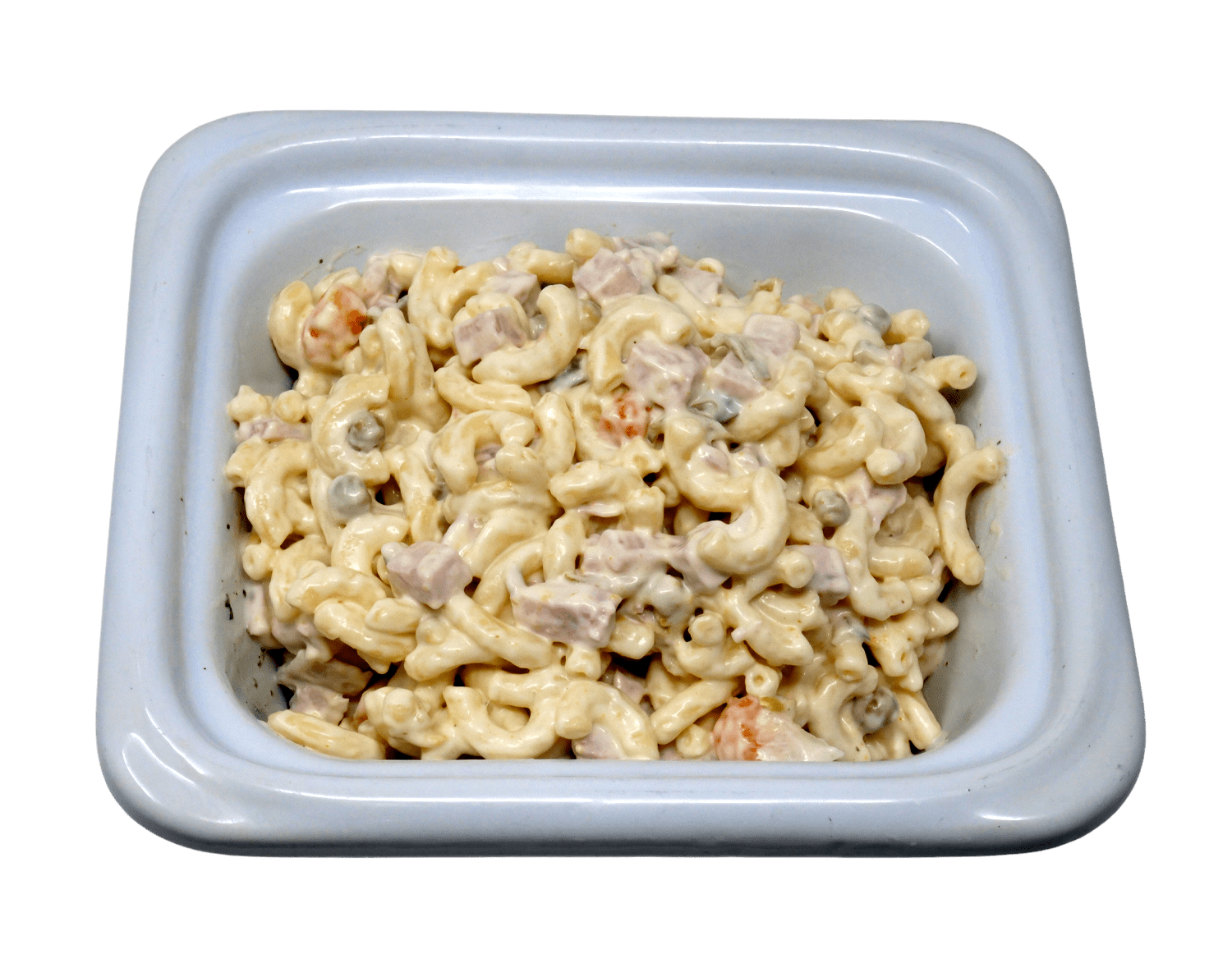 EIERTEIGWAREN (Durum-HartWEIZENgrieß, FrischEI ( 12,5 % ), Schinkenwurst (60% Schweinefleisch, Trinkwasser, Speck, Rindfleisch, Speisesalz, Gewürze, Dextrose, Stabilisator E450, Antioxidationsmittel E300, Gewürze Konservierungsstoff E250.), Kochschinken (Schweinefleisch, Trinkwasser, E450 Diphosphat, E300L Ascorbinsäure, Konservierungsstoff: Natriumnitrit) Gewürzgurken (Gurken, Wasser, Brantweinessig, Speisesalz, natürliches Gewürzaroma), Karotten, Erbsen, SalatMAYONNAISE (Rapsöl 50%, Wasser, Branntweinessig, Zucker, EIGELB, Stärke, WEIZENSTÄRKE, Salz, Verdickungsmittel Guarkernmehl, Xanthan, Natriumalginat, Säureregulator: Natiumacetate natürliches Aroma, Salz, Pfeffer