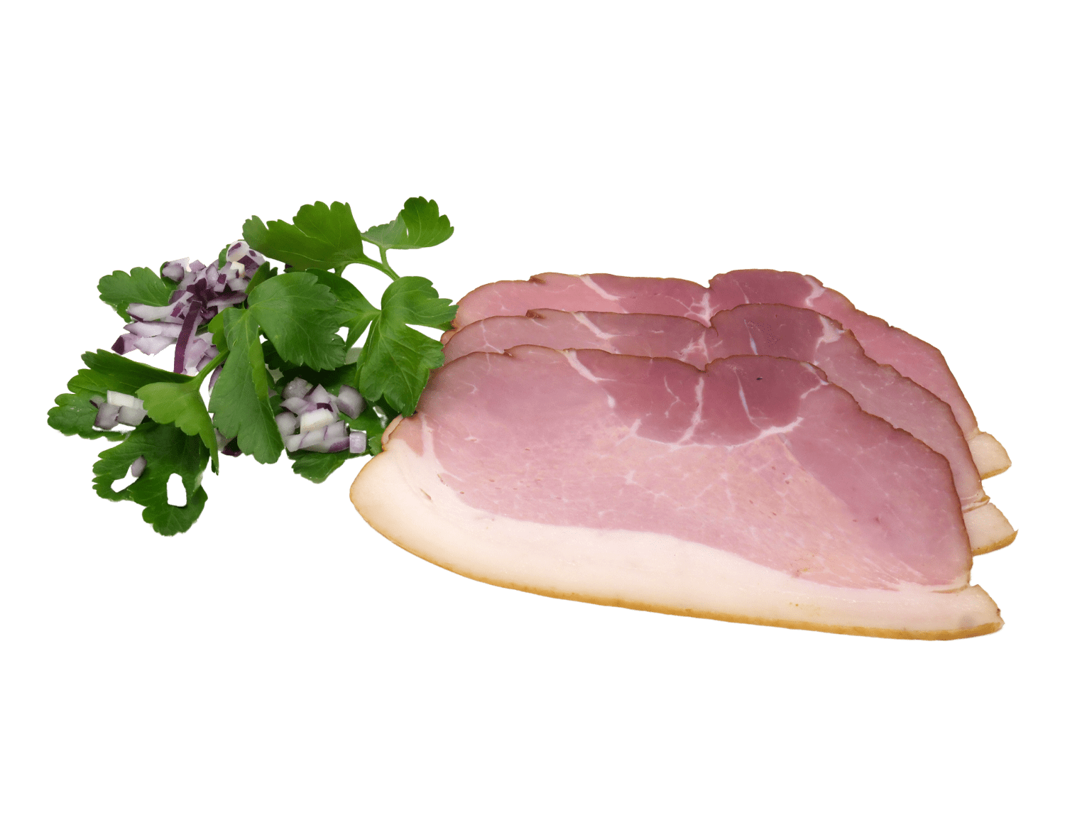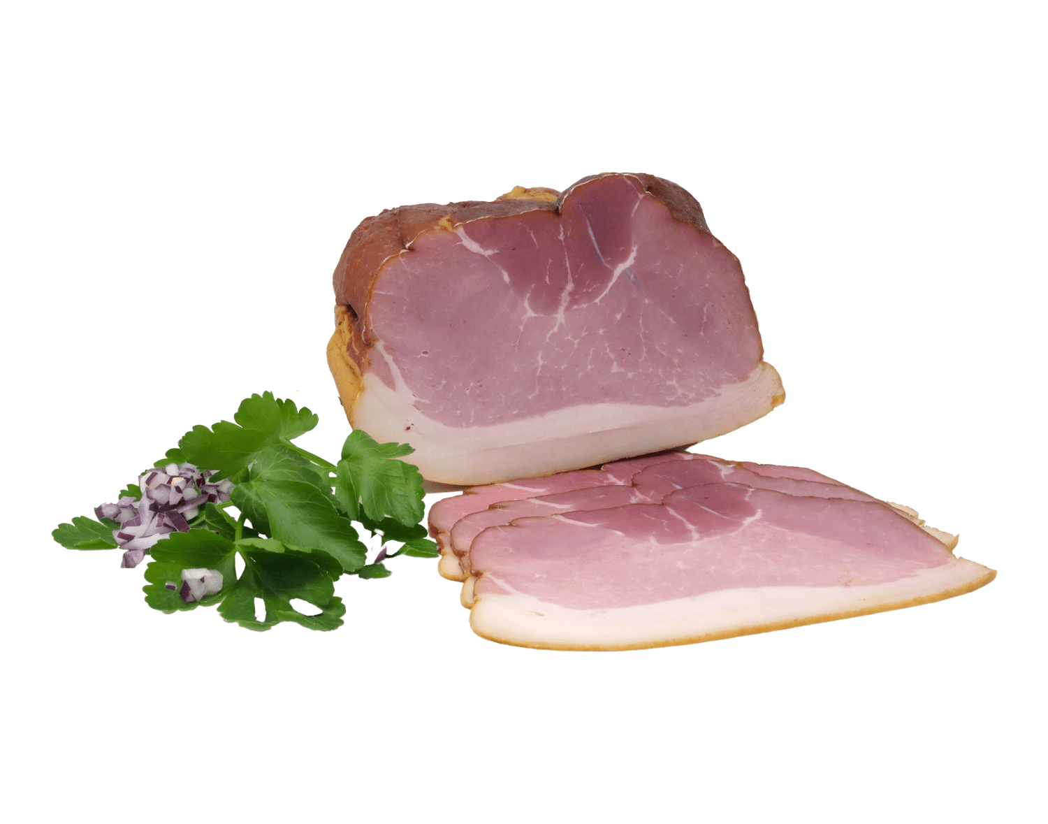 Unser gepökelter und geräucherter Schinkenspeck ist mit seiner dezenten Speckschicht und vorwiegend zarten Fleischanteilen eine Zutat für deftige Hausmannskost. Man kann ihn zum Anbraten diverser Fleischgerichte ebenso verwenden wie für Beilagen für Eierspeisen als sogenannter Frühstücksspeck und zur pikanten Füllung von Rouladen. Wir bieten den Schinkenspeck am Stück und in Scheiben geschnitten an.