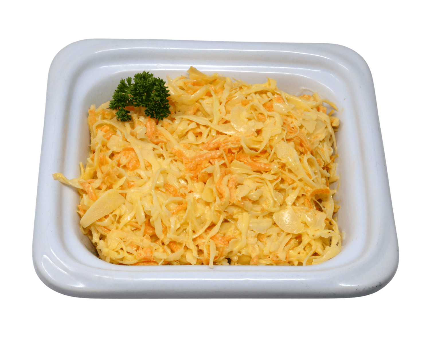 Weißkohl 70 %, Karotten 20%, Zucker, Rapsöl, SAUERRAHM, MAYONNAISE (Rapsöl 50%, Wasser, Branntweinessig, Zucker, EIGELB, Stärke, WEIZENSTÄRKE, Salz, Verdickungsmittel Guarkernmehl, Xanthan, Säureregulator: Natiumacetate, natürliches Aroma, Branntweinessig, Zwiebeln, Salz, Gewürze, Antioxidationsmittel: Ascorbinsäure